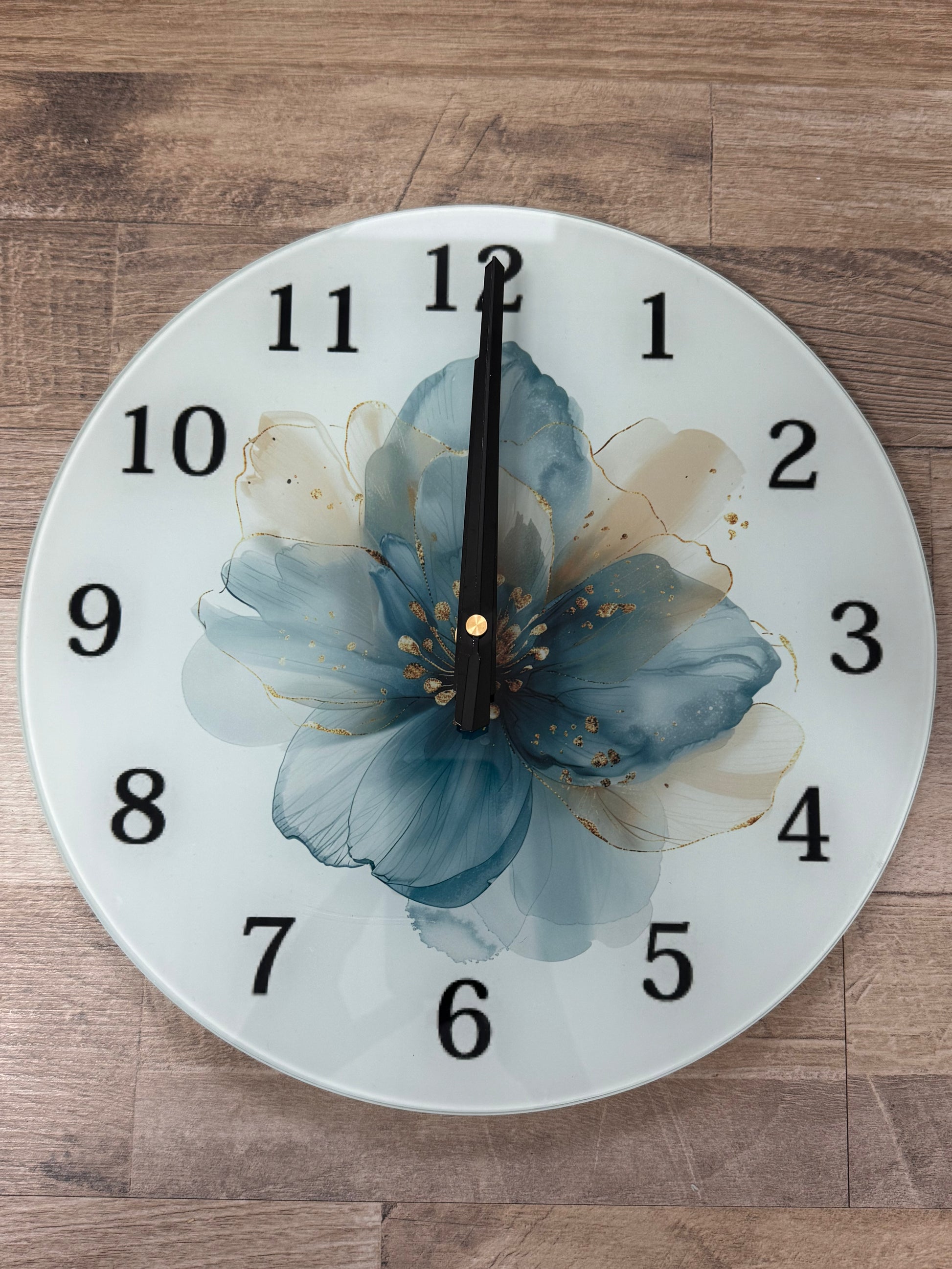 Horloge murale en verre trempĂ© â 11,8â x 11,8â (30 x 30 cm) |Fleur bleue Ă©lĂ©gante
